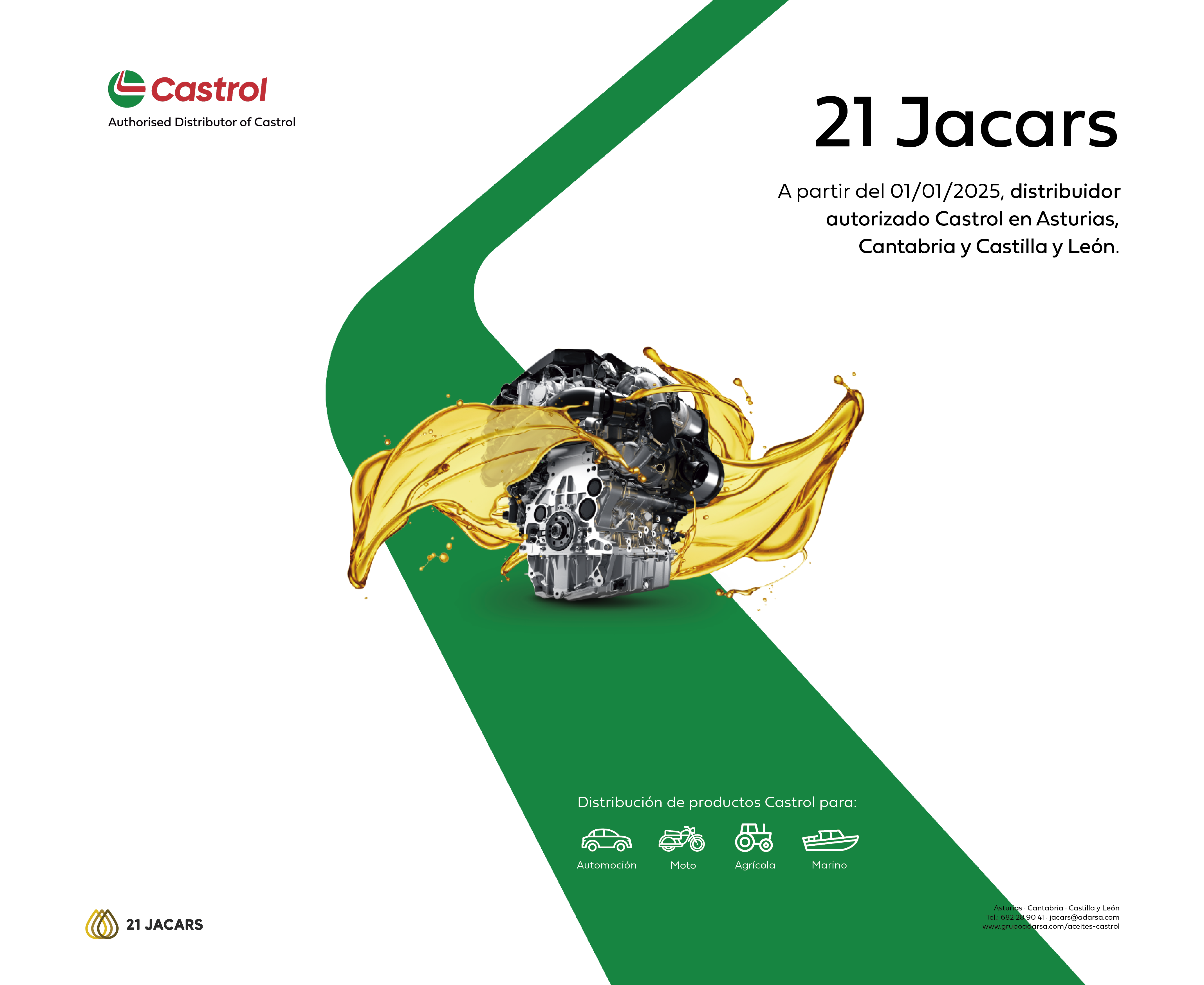 21 Jacars, empresa del Grupo Adarsa, está especializada en la comercialización de lubricantes para el sector de la automoción y es distribuidora autorizada de Castrol en Asturias, Cantabria y Castilla y León.