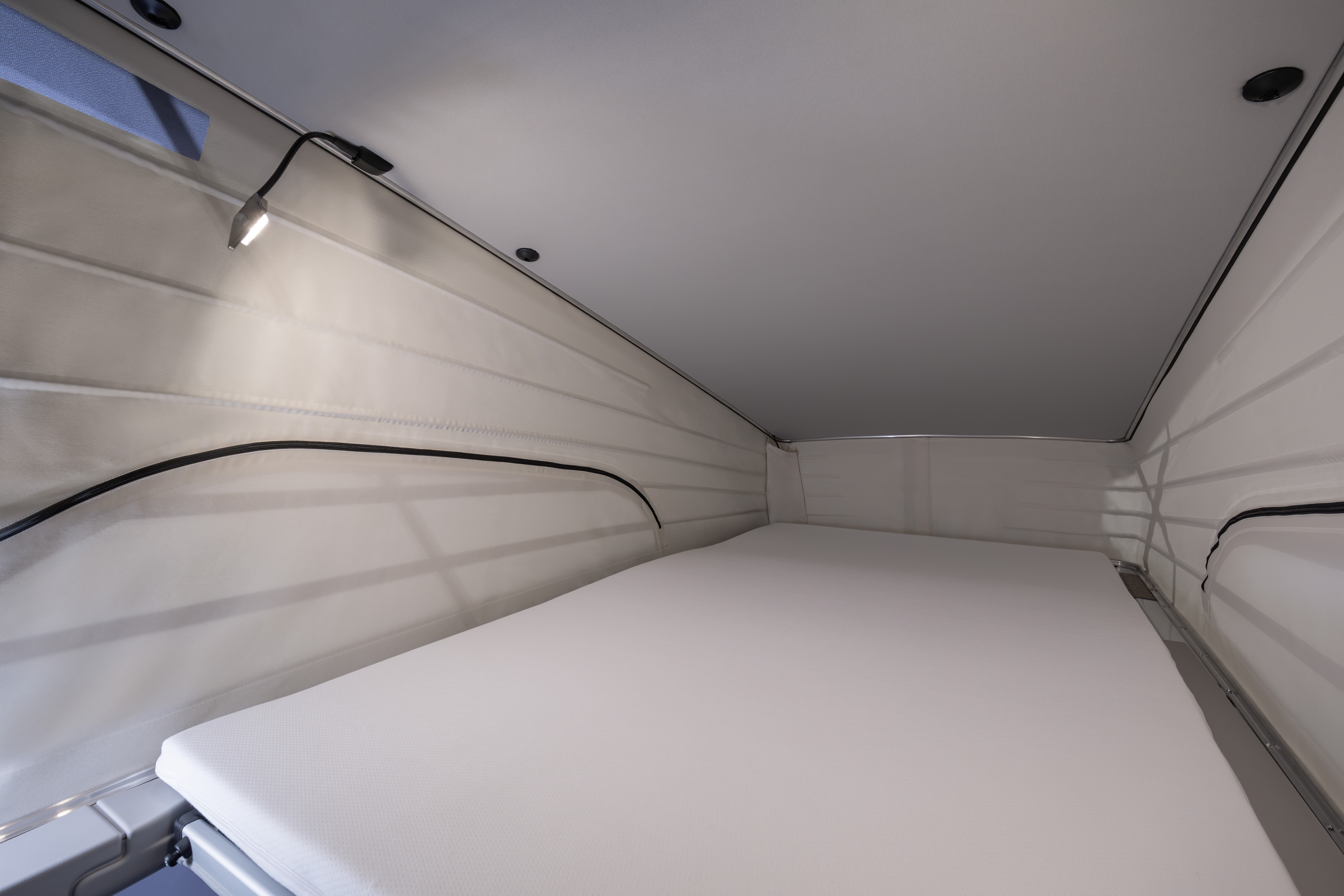 El habitáculo ofrece una distribución inteligente que permite alojar hasta cuatro personas, gracias a su sistema de camas integradas y al techo elevable. Además, incorpora una cocina completamente equipada con fogones, fregadero, nevera y soluciones de almacenamiento, lo que permite disfrutar de una total autonomía durante el viaje.